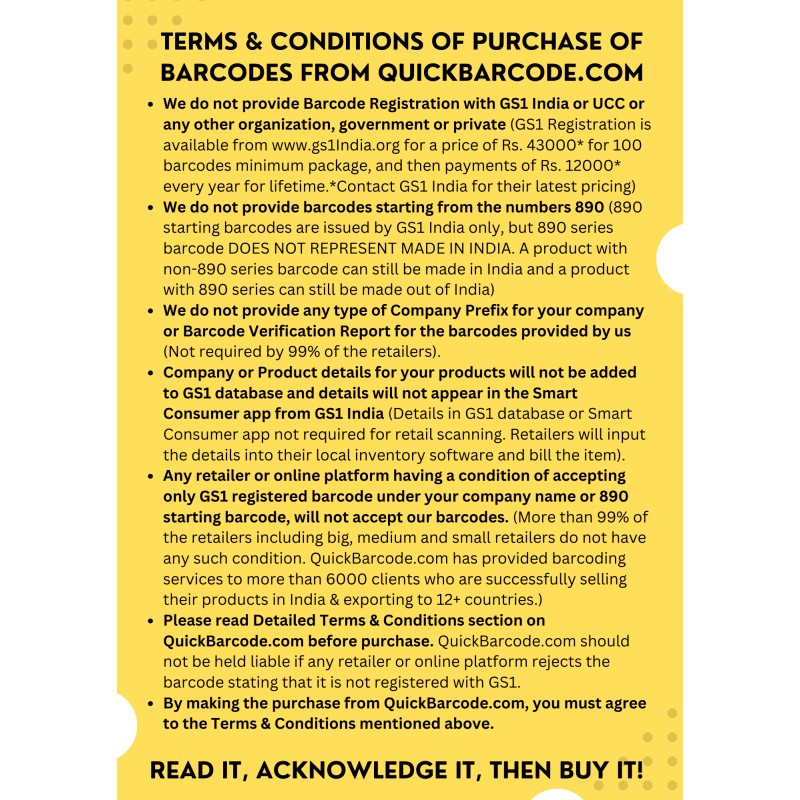 100 Barcodes for 100 different products or SKUs, unlimited quantity of these 100 SKUs. + 1 Dynamic QR Code FREE For Your Brand with QR Code Editing Link & Password.